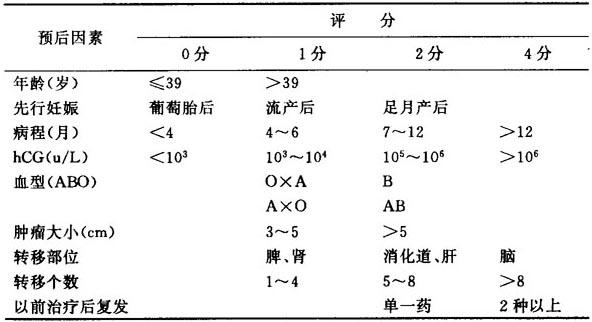 【预后】 由于化疗的进展,死亡率已有明显降低,为20%~30%,其预后与多因素有关,WHO有预后评分表,见表1.6.3。 表1.6.3 绒癌预后评分表