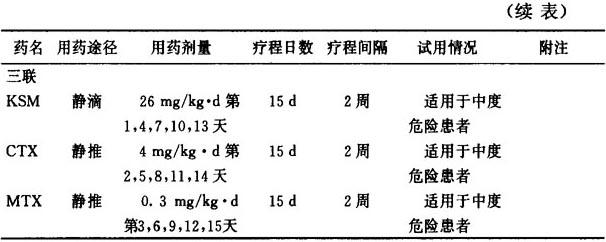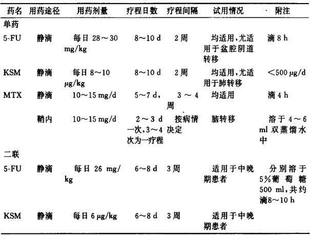 注O×A,A×O指患者与丈夫血型;B,AB指患者血型;低度危险≤4分,中度危险5~7分,高度危险≥8分 【治疗】 治疗原则以化疗为主。 1.化疗 常见化疗药物:5-FU、更生霉素(KSM)、甲氨蝶呤(MTX)、环磷酰胺(CTX)、长春新碱(VCR)、鬼臼乙叉甙(VP-16)。主要化疗药物见表1.6.4。 用药原则:低度危险常用单药治疗,中度危险宜联合化疗,高度危险或耐药病例用EMA-CO方案。 EMA-CO方案: 第1天VP-16100mg/m2+生理盐水200ml静注;KSM0.5mg静注;MTX100mg/m2静注;MTX200mg/m2静滴12小时。 第2天VP-16100mg/m2+生理盐水200ml;KSM0.5mg静注;FA(叶酸钙)15mg在MTX后24小时开始,肌注或静注,每12小时1次,共4次。 第8天VCR1mg/m2静脉推注;CTX600mg/m2静注。 用药时间举例:1,2,8,…15,16,22(d)… 表1.6.4 几种化疗方案的剂量和用法