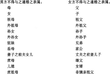 | 释义 | 结婚的禁止条件 在香港在下列情况下,不得结婚。 1.法律所禁止的亲属范围之内。 法律禁止一定范围的血亲结婚,是道德及优生的要求。现代任何国家都禁止一定范围内的血亲结婚,只是在禁止的范围上宽严不等,香港婚姻制度规定的禁止结婚的亲属关系是直系血亲及三等亲以内的旁系血亲,只有在此限之外的亲属关系才可结婚,香港禁婚亲属如下: