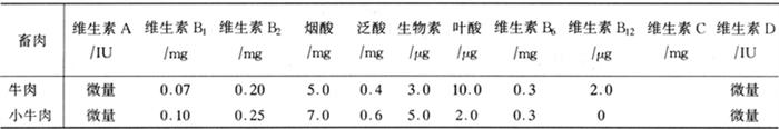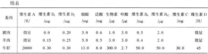 | 释义 | 维生素 肉中维生素主要有维生素A、维生素B1、维生素B2、维生素C、维生素D、烟酸、叶酸等。其中脂溶性维生素较少,而水溶性维生素较多。肉是B族维生素的良好来源,尤其是人类膳食维生素B12(钴胺素)和维生素B6的重要来源。各种肉类的维生素含量也有不同,如猪肉中B族维生素特别丰富,但维生素A和维生素C很少,而牛肉中的叶酸、维生素E和维生素B族相对较多,见表1-3-15。 表1-3-15 肉中维生素含量 单位:mg/100g鲜重
