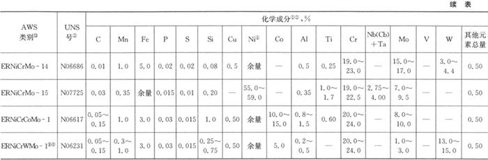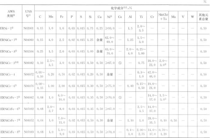 从AWS A5.14/A5.14M-1997来看,在此版的标准中增加了许多新的类别如ERNiCu-8、ERNiCr-6、ERNiCrFe-7、ERNiCrFe-8、ERNiCrFe-10、ERNiMo-8、ERNiMo-9、ERNiMo-10、ERNiCrMo-10、ERNiCrMo-11、ERNiCrMo-13、ERNiCrMo-14、ERNiCrMo-15、ERNiCrCoMo-1和ERNiCrWMo-1等。除这些类别外,由于我国等效采用美国AWS标准,其余类别与我国标准GB/T 15620-1995完全相同。 |
