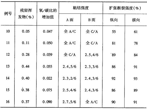 PMDA=均苯四酸二酐;BPDA=3,3′4,4′-联二苯四甲酸二酐;PPD=对苯二胺;ODA=4,4′-二氨基二苯醚。 其二,为进一步改善聚酰亚胺薄膜的粘结性,薄膜中残留挥发物的量应在0.45%以下。此外,薄膜表面的氧碳比还应为0.01%~0.1%。也就是说,对这种薄膜进行电晕放电处理可以进一步提高其粘结能力。 例10~13 将均苯四酸二酐和4,4′-二氨基二苯醚,按上法制成厚为50μm的聚酰亚胺薄膜。将此薄膜加热处理,制成残留挥发物不同的薄膜。然后在其两面以200W/(m2·min)进行电晕放电处理。薄膜的残留挥发物量、表面氧/碳比的增加值及粘结强度列于表3。 例14~16 按与例10~13相同的方法,制成厚75μm的聚酰亚胺薄膜,在450℃下加热处理1分钟,再进一步对此薄膜进行电晕放电处理或等离子体处理,使薄膜的氧/碳比不同,其粘结强度等性能也不同,见表3。但其粘结性能都有不同程度的改善。 表3 表面经等离子体处理的聚酰亚胺薄膜的性能