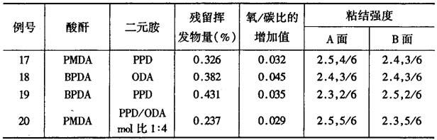 例17~20 采用与例1相同的方法(等摩尔数),按表2制成厚50μm的聚酰亚胺薄膜。其残留挥发物的量、表面氧/碳比的增加值及粘结强度列于表4。 表4 不同的聚酰亚胺薄膜经表面处理后的性能