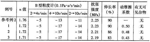 (2)钛磷化物(R8On)-Ti-(P-OR9)2]6-n。式中,n=0~6;R8=C3~C18烃基、-R10-O-R11-;R9=C3~C8烃基;R10,R11=C1~C8羟基。 所添加的无机粉末为磷酸氢钙CaHPO4或焦磷酸钙Ca2P2O7。 此种产物在制薄膜时流动性良好、机械性能良好,无可见的过滤杂质。 参考例2 均苯四酸二酐1mol和二氨基二苯醚1mol,与二甲基甲酰胺用类似于参考例1的方法制成固体份浓度为15%,用B型粘度计(NO.320r/min)测得的在23℃时的粘度为270Pa·s的聚酰胺酸溶液,再用其制成25μm厚的聚酰亚胺薄膜。 例1 在参考例2制得的聚酰胺酸溶液100g(固体)中,加表面处理物质钛磷化物0.05g,再添加磷酸氢钙0.005g,搅拌均匀后制成薄膜。聚酰胺酸溶液的流动特性、所制成的聚酰亚胺薄膜的特性列于表5。 例2 采用与例1那样的表面处理方法,但磷酸氢钙的添加量改为0.1g,再采用与例1相同的方法,所制得的薄膜的特性列于表5。 例3 进行与例1相同的表面处理,但磷酸氢钙的添加量改为0.5g,再采用与例1相同的方法,所制得的薄膜的特性列于表5。 表5 聚酰亚胺薄膜滑性的改良