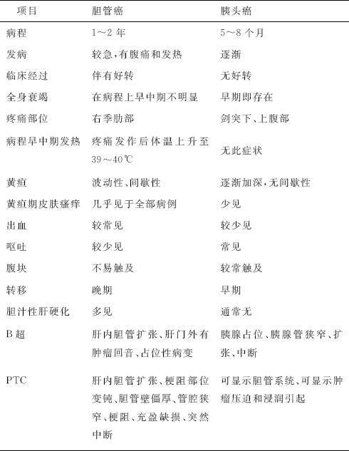 | 释义 | 肝外胆管癌 肝外胆管癌(carcinoma of the bile ducts)是指乏特壶腹以外的肝外胆管癌肿。远端胆总管癌、胰头癌、壶腹癌与十二指肠乳头癌则统称壶腹周围癌。近年来,胆管癌有增加的的趋势,这一方面是由于广泛应用新影像学技术和胆管造影技术的结果,使胆管癌患者在术前能明确诊断的例数有所提高。 (一)病因病理 本病病因至今尚不清楚,有16%~30%的胆管癌患者伴有胆结石,故结石的慢性刺激被认为可能是一个致癌因素;先天性胆总管囊肿患者胆管癌发生率高;胆管良性乳头状瘤可转变为胆管癌,原发性硬化胆管炎合并溃疡性结肠炎者发生胆管癌的比例高,有报道0.4%~1.4%。胆管血吸虫病也是病因之一。胆管癌在尸解中的发病率为0.2%,占所有癌肿患者尸解的2%,占胆管手术的0.5%。男性稍多,多在50~70岁,60岁以上更多见。组织类型90%左右为腺癌,且60%分化良好。 (二)临床表现 1.持续进行性梗阻性黄疸。尿浓茶色,粪便灰白。 2.上腹隐痛伴有消化不良的表现和体重下降。 3.有出血倾向,呕血或黑便。 4.可有发冷,发热。 5.查体 皮肤,巩膜黄染,胆总管下端疼可触及肿大的胆囊,肝大质硬,晚期有门脉高压症表现。 (三)诊断 1.多见于老年患者,男性多于女性,若为年轻患者,常与原发性硬化性胆管炎有关。 2.黄疸及皮肤瘙痒 是常见症状。黄疸多为持续性、进行性加深,有少数患者可出现一过性黄疸减退,一般不伴发热,食欲减退多见。多有中上腹部触痛,少数患者有腹泻、消瘦。 3.肝脏明显肿大,可达肋缘下,表面光滑。低位胆管癌时,可摸到肿大的肝囊。 4.血清胆红素以直接胆红素升高为主,间接胆红素也升高。转氨酶轻度升高,白蛋白降低,凝血酶原时间延长,胆固醇常增高。碱性磷酸酶升高。粪便潜血阳性,血中红细胞总数和血红蛋白降低。 5.B超检查对胆管梗阻的部位和程度的诊断率高,B超引导下细针穿刺抽吸细胞学检查可发现癌细胞。PTC检查可见胆管壁增厚、管腔狭窄、梗阻、充盈缺损或突然中断等现象,ERCP对胆总管的诊断价值略逊于PTC。CT和MRI能显示扩张的肝内外肝管外,还能分辨病变的大小、部位和性质。十二指肠低张造影可显示乳头附近黏膜受侵犯的征象,十二指肠液细胞学检查有助于诊断。 (四)鉴别诊断 1.胆管癌与胰头癌的鉴别,见表7-5。 表7-5 胆管癌与胰头癌的鉴别