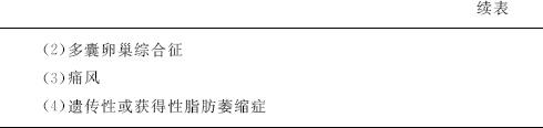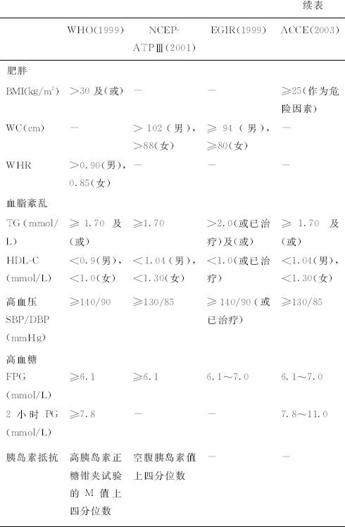 (1)肥胖病:肥胖病是MS的主要临床代谢病组成成分之一。在芬兰进行的一项研究发现,只有肝脏脂肪含量与体内胰岛素水平有非常好的相关性,因此,用内脏脂肪含量、而不是腹腔脂肪含量作为衡量IR的指标更为合理。MS患病率与腰围或腰臀比增加的关系比与体质指数(BMI)增加的关系更为密切。目前内脏脂肪含量较直接的估测方法是用腹部核磁共振或CT检查计算脂肪面积,一般将内脏脂肪面积≥100cm2认为是内脏型肥胖的诊断切割点。 研究中国成年人内脏型肥胖频率与BMI的关系时发现,中国人有总体脂肪不多但是体脂易在腹腔内积聚的倾向,表明在中国人中内脏脂肪积聚时对健康的危害性较大。 现在以色列医生Aronson研究发现,受试者达到代谢综合征诊断的个数越多,C反应蛋白(CRP)水平也越高,但按体重指数校正后,这种趋势明显减弱,故说明肥胖是导致MS相关的慢性亚临床炎症最重要的因素。而CRP水平可以反映冠心病的风险,能预测心肌梗死的危险,同时它还是不稳定性心绞痛预后不良的标志之一。 内脏脂肪细胞的代谢比皮下脂肪细胞活跃,故内脏型肥胖时脂肪细胞内的TG易分解形成游离脂肪酸(FFA),FFA释入循环增加,即发生了脂肪外溢(spillover)。在高FFA血症环境下,许多非脂肪组织内代谢发生了变化,其中变化之一是这些组织器官内出现TG沉积。脂肪细胞尚分泌多种脂肪细胞因子。肥胖时这些脂肪细胞因子的分泌变化不但涉及以脂肪形式进行的能量储存及释放,尚涉及组织的胰岛素敏感性、低度炎症反应及凝溶异常。细胞因子间的相互作用及细胞因子的多重作用致上述机制间发生交互联系。 (2)胰岛素抵抗:综合估测组织处置血糖能力的经典方法是高胰岛素正糖钳夹技术。它是测定的胰岛素介导的葡萄糖代谢率[M值,mg/(kg·min)],用以测定组织对外源性胰岛素敏感性,是国际上评估IR的金标准,此方法可避免了“内源性胰岛素缺乏”(如在糖尿病患者)及“低血糖”(如在胰岛素耐量试验中)对胰岛素敏感性测定的影响,成为在糖耐量正常、糖耐量减低及糖尿患者群均可信赖的技术。但因这种测定是一种有创伤的检查,取血次数太多,而且耗时较长,费用也很昂贵,难于被患者接受,故目前还发展了许多根据空腹和(或)负荷后血糖及胰岛素水平间的关系而演算成的胰岛素敏感性的简易估算公式,这些公式便于流行病学及临床研究。其中,应用较普遍的是稳态模型(homamodel)的胰岛素抵抗指数评估公式——HOMA-IR(空腹血糖×空腹胰岛素/22.5)。各种群,包括中国人的研究在内均见到个体具备的MS组成成分越多,IR程度越高。另一方面,IR越明显的人群中MS的患病率亦越高。中华医学会糖尿病学分会认为在流行病学或临床研究时IR程度可用简易公式如应用HOMA-IR进行估测,可用所研究特定人群的上四分位数作为IR的分割点。由于胰岛素测定方法尚不一致,所以必须用取得研究样本的背景人群数据来确认其分割点。 (3)糖尿病、血脂紊乱及高血压:大多数学者对MS的工作定义中包括了这三个组成成分,至于三者在诊断MS中应用的切割点则各家有较明显差异。三者具体与代谢综合征关系见本章第二节。 (4)心血管病:MS的主要后果是心血管病。心血管疾病是影响2型糖尿病患者死亡率的主要因素,因此糖尿病与心血管病之间的关系受到深入的关注和研究。胰岛素抵抗和代谢综合征导致动脉粥样硬化的主要危险因素是小而密的低密度脂蛋白(LDL)颗粒的增加以及高密度脂蛋白(HDL)的减少。此外,促炎状态和高凝也增加代谢综合征患者的心血管危险。 2001年美国国家胆固醇教育纲要-成人教育组第3次报告(NCEP-ATPⅢ)中指出,糖尿病患者与已有冠心病者在10年内发生新的冠心病事件的危险程度相等,即呈等危情况。在临床上确认MS对预测个体发生心血管病有重要意义。 2.诊断标准 目前无一致公认并适用于各种群的MS诊断标准。除WHO诊断标准外,NCEP-ATPⅢ、欧洲胰岛素抵抗研究组(EGIR)以及美国临床内分泌医师学会(AACE)尚分别从不同角度提出了以MS(NCEP-ATPⅢ标准)或以IR综合征命名的诊断标准(表14-2)。现在,中华医学会糖尿病学分会根据目前在中国人群中用WHO标准及NCEP-ATPⅢ标准进行MS诊断的资料分析结果及在中国人群中对MS的研究结果,结合目前中国常用临床检测项目情况,提出在中国人群中的MS的诊断标准(CDS诊断标准)(表14-3)。 表14-2 MS/胰岛素抵抗综合征诊断标准比较