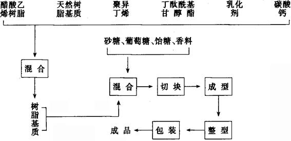 | 释义 | 胶基糖果加工装备 1 概述 胶基糖又称胶姆糖,以白砂糖为主料,配以可食用的天然树胶或热塑性树脂等胶基制成的可咀嚼的口香糖或吹泡泡的固形糖块。 胶基糖是目前国际上流行低热值食品之一,被人们誉为“礼貌糖果”、“美容糖果”。通过不断咀嚼胶基糖,有消除口臭,加快口腔内血液流动,预防口腔感染,使面部肌肉增加弹性,不易产生皱纹等效用,因此较受人们的青睐。胶基糖关键加工装备是搅拌机、成型设备。 2 加工工艺 2.1 口香糖加工工艺 口香糖系咀嚼类胶基糖。它以白砂糖为主料和胶基制成的。咀嚼时具有较强的粘着性、延伸性。有水果味、清凉味及花香味等品种。图1-11-17所示为板式口香糖加工工艺流程。