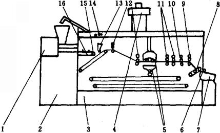 图1-11-18 口香糖成型机示意图 1-控制柜 2-挤出机 3-压延切块系统 4-吸尘装置 5-粉尘回收装置 6-报警器 7-集料器 8-输送带 9-横切刀 10-纵切刀 11-定形辊组 12-压延辊组 13-撒粉器 14-总开关 15-挤出输送带 16-检测装置 挤出机是成型设备的主要部分之一。其作用是将坯料制成片状或条状。挤出机主要结构如图1-11-19所示,它由机架、控制柜、传动系统、螺杆、料斗、挤压室、进出水管、加热器、出料口等部分组成。