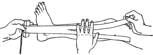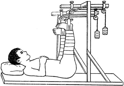 | 释义 | 胶布皮肤牵引 胶布皮肤牵引是利用粘贴在伤肢皮肤上的胶布拉力,其牵引力直接加在皮肤上,间接地对抗肌肉收缩力。此法操作简单,伤员痛苦小,但胶布和皮肤的粘着力不能持久,也不能承受过重的牵拉力。因此,皮肤牵引的持续时间不宜超过4周,重量不宜超过6公斤。对胶布过敏、伤肢皮肤有擦、裂伤者,远侧血循障碍及皮肤有慢性炎症者禁用。 一、下肢皮肤牵引: 【适应症】 小儿股骨干骨折,外展型股骨颈骨折、老年人股骨粗隆间骨折、髋关节脱位整复术后等。 【器材准备】 滑轮支架1个,尾档板1个,牵引绳、胶布、安息香酸酊、绷带、纱布、重量砝码。 【操作方法】 伤肢用水洗净擦干,在平骨折线以下的皮肤上涂以安息香酸酊,增加粘度和防止发生水泡,然后取5~8厘米宽(儿童为3厘米左右),长度相当于骨折线以下,肢体长度的2倍+12厘米的胶布,在胶布全长的中点,剪一孔,恰与尾档板的中心孔相对,使胶布紧紧粘着在尾档板上,再将胶布两上段按等份纵行剪开,粘贴时,由助手持尾档板,使其正对伤肢足底中心,术者将胶布在平骨折面以下分别贴于伤肢的内外侧,并与皮肤纵轴一致,当胶布经过骨骼隆起处时,应于胶布内衬纱布垫保护,粘贴后用手压匀,使平整无皱褶(图8~1),外面用绷带由下而上缠绕固定。于尾档板中心孔中穿入牵引绳,通过床尾的滑轮支架,作水平牵引。
