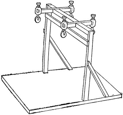 图8~2 悬吊牵引架 【操作方法】 皮肤准备及胶布制作、粘贴方法同前。将患儿置于悬吊牵引架上,屈髋90度,两下肢伸直,通过牵引架上的滑轮进行牵引(图8~3)。