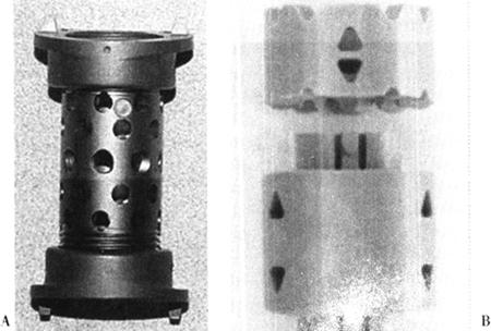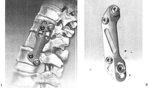 图13-31 替代型固定器(A.Sofamor的Verte-Span的人工椎体;B.Verte-Stack层叠式融合器) 根据Denis三柱理论,腰椎损伤尤其是椎体爆裂性骨折,脊柱至少两个柱的稳定性遭到破坏,椎管形态必然发生变化,椎管内的脊髓或马尾神经不可避免的遭受损害。因此,减压和稳定是腰惟损伤的主要治疗措施,而直接减压、恢复或重建腰椎前柱完整性和稳定功能尤其重要。在腰椎骨折服位施行前路减压植骨术后,除某些陈旧性骨折或后路已行内固定外,均应行前路内固定术。只做椎体间植骨则稳定性不够,易发生植骨脱出、植骨不愈合和迟发性驼背畸形。使用内固定有利于术后护理和早期活动,并可维持复位,利于植骨块的融合。 腰椎损伤所用的前路内固定多数设计是以螺钉固定到伤椎的上下位椎体,用螺纹棒或钢板连接上下螺钉。随着材料学、生物力学的发展,出现了大量的腰椎前路内固定器,使用棒的有Depuy的Kaneda SR(光滑棒的Kaneda)(图13-32A)、Sofamor的TSRH和CD Horizon Antares(图13-32B)、AO的Ventrofix(图13-32C),使用板的有Sofamor的Z-plate(图13-33A)、Depuy的Profile(图13-33B)、AO的ATLP。新型的前路内固定器械除了有优良的支撑力外,抗旋转和侧屈能力都很强,在维持脊柱稳定的同时促进植骨融合。生物力学测试表明,虽然前路双棒系统和板系统都能提供高于正常脊柱的稳定性,但双棒系统在抗扭转和侧屈方面优于板系统。板系统的优点是切迹低,避免刺激和损伤内脏器官以及大血管。Gurr在小牛脊柱动物模型上比较Kaneda与后来椎弓根系统的生物力学特性,发现跨越5个节段的后路内固定系统与跨越3个节段的前路内固定系统生物力学性能相同。
