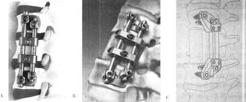 图13-32 胸腰椎前路双棒固定系统(A.Depuy的Kaneda SR;B.Sofamor的CD Horizon Antares;C.AO的Ventrofix)