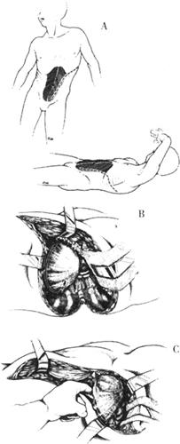 图13-34 Kaneda SR系统的垫片、螺钉和横向连接器 (1)麻醉和体位:全身麻醉,患者侧卧位,腰垫枕抬高或将手术床折弯以分别显露。根据脊柱骨折的严重侧别,可采用左或右侧入路。一般取左侧入路,避开腹主动脉和下腔静脉,另外右侧的肝脏也难牵开。 (2)入路:作一曲线切口,根据需要可向上下两头延长(图13-35A)。切除比伤椎高2节的肋骨,切除第10肋可显露T10~L2,T12~L1显露最充分。惟一的困难是辨认作为分隔结构的膈肌,它与胸腔壁贴得很近,在切开胸膜时,肺缘可突入到刀下的间隙中(图13-35B)。在进腹腔时要注意,由于腹横筋膜和腹膜在前侧是连在一起的,分离时要小心.并辨认清腮肌两侧的胸、腹腔。为达到胸、腹腔汇合,可将膈肌从下部肋骨上牵开,将膈肌脚从脊椎上分离牵开(图13-35C);或采用另一方法,距止点2~3cm处切开膈肌,用缝线牵开,术毕准确缝合。切开椎前筋膜,仔细辨认横过椎体中部的节段动静脉。在预显露的椎体中部小心游离、结扎、切断节段动、静脉,剥离椎体骨膜,显露椎体。