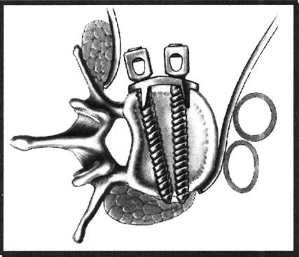 图13-43 Harrington撑开装置示意图 如果器械固定部位是在下腰椎,主张使用按照腰椎的前突预弯成形的方形头Harrington棒,并且使用改良的方头钩。这可以保持正常的腰椎前凸和增加稳定性。在胸椎和胸腰椎结合部位,传统的圆形头Harrington棒和方形头棒均可以使用。术后处理:患者术后开始卧床休养,拆线后石膏或支具固定12周。支具固定后开始下床活动,鼓励早期活动和康复锻炼。 Harringtion压缩固定器械可以用于胸腰椎骨折,特别是在有后柱因张力而破坏的情况下。有小号(3.18mm)和大号(4.76mm)两种带螺纹的压缩棒可以为骨折愈合和后外侧柱融合提供坚强的固定。它们在固定屈曲牵开型损伤和Chance骨折中最为有用。在用于胸椎时,Harrington压缩棒应该与安放在横突基底周围的钩结合使用。在腰椎,钩应该安放在椎板深部,以提供牢固的固定。研究已经证实,压缩棒不应该与椎板下钢丝合用,因为钢丝可能将椎板下钩拉至深面的神经结构,引起医源性的神经损伤。安放在横突上的钩要比安放在椎板下的钩所产生的力量小,但不易损伤神经结构。生物力学研究发现,在治疗屈曲与旋转相结合的损伤时压缩棒要比撑开棒的力量强。压缩棒在屈曲和侧弯时容易使横突骨折而导致手术失败,也容易在伸展时因脱钩而失败。 Harrington器械提供了长节段的牢固固定,但牺牲了胸腰椎矢状面上的曲线,也不能在胸腰椎交界处提供前凸。由于Harringtion器械不能很好地控制上钩的屈曲和旋转,使钩-椎板界面的应力集中在椎板边缘,所以脱钩很常见。过度的椎板切除和撑开可以造成椎板骨折。如果留在钩外的棒长度小于1cm,钩就很容易从棒上脱出。虽然有如此多的并发症,但Harrington器械仍然能为患者的脊柱提供足够的稳定性,在它的基础上发展出了许多新型的脊柱后路内固定器械。 (二)Luque器械 1976年,在墨西哥城的一个着名内科医生Eduardo Luque在Harrington器械的启发下,发明了新的的棒系统。Iuque棒是预弯的圆型棒,直径有4.76mm和6.35mm两种,通过多节段椎板下钢丝固定在脊柱上。Luque棒使用多节段的固定,比传统的Harrington固定器械能提供更牢固的内固定和抗旋转力量。这种器械曾被用于矫正脊柱侧弯畸形,也用于胸腰椎骨折和脱位的固定。McAfee已经证明Harrington棒的抗扭转性能较差,而可以承受最大能量的系统是Luque节段系统。生物力学测试发现Luque节段性脊柱固定器械的失效是由于固定节段以上或以下的骨折-脱位引起。正如生物力学所证明的那样,Luque系统的薄弱点是不能抵消纵向负荷,所以它不能为不稳定的爆裂性骨折提供牢固的固定。此系统似乎最适合于治疗伴有完全神经损伤的胸椎或腰椎的平移损伤。当用于神经功能正常或有不完全神经损伤的患者时,穿椎板下钢丝时一定要小心,避免损伤神经。椎板下钢丝的神经系统并发症发生率比较高,约10%患者有感觉障碍,还会影响脊髓血供出现术后瘫痪。对于术后瘫痪的患者要立刻手术,拆除内固定。 手术方法:患者俯卧,显露脊柱需要做固定的节段。对胸腰椎的骨折-脱位,我们主张使用牢固的Luque长方形结构或者使用双棒固定。范围为上方3个节段、下方3个节段。用咬骨钳去除覆盖在需要固定的每个节段的椎板间隙中的软组织以显露黄韧带。腰椎段因为有脊往前凸,所以在椎板间隙处椎板经常呈叠瓦状。用咬骨钳去除这些骨组织。用咬骨钳咬开黄韧带,用小的椎板咬骨钳将其去掉。需要用器械固定的间隙中的黄韧带都要去除。将1.0mm的钢丝做成襻,将襻弯成两个直角,将钢丝襻从每个椎板下穿过,两个弯处的距离应该与准备固定的椎板的宽度相等。从头侧向尾侧方向穿过钢丝(图13-44)。将中间节段的钢丝襻分开,这样每个椎板下有两根钢丝,将其牵向伤口的两侧。在穿钢丝时小心不要用力使钢丝挤压硬膜。切除两侧的关节,椎板去皮质后在关节周围植骨。插入Luque棒,小心使每个棒的短臂或横臂压在长臂或纵臂下以预防旋转和植入物旋转后的移位。小心将钢丝围绕棒拧紧,使脊柱与棒固定在一起(图13-45)。常从棒的中间开始拧紧钢丝,然后依次向两侧拧紧其他钢丝。爆裂性骨折可以通过Harrington棒固定以防止塌陷。常规做侧后方关节融合,插入负压引流管后,逐层缝合伤口。