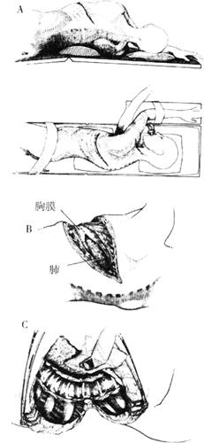 图13-36 Kaneda SR椎体螺钉位置和角度 (5)术后处理:早期下地功能锻炼,支具保护10~12周,或X光片证实植骨融合为止。 (二)Z-plate Ⅱ系统 由Zdeblick设计的Z-plate系统现在已经发展到Ⅱ型,钢板分胸腰段和胸段两种,有屈度分别适应胸椎后凸和腰椎前凸,胸段的板也比腰段薄。钢板外形不规则,下端有2个圆形螺钉孔,上端则右2滑槽,加压时螺钉可在槽中滑动。板的设计适合椎体左侧的屈度,如果需用在椎体右侧,放置时要将板上下翻转。板长5~13cm,可跨越1~3个椎体,可用于T5~L5。Depuy的Profile钢板比它更薄,切迹低1.5mm,甚至可用到T1。钉有螺钉和螺栓,螺栓直径70mm,用在椎体后部,并有锁紧螺帽;螺钉直径65mm,用于椎体前部。 (1)麻醉与体位:同Kaneda手术。 (2)入路:胸腰段手术入路同Kaneda手术。胸段采用经胸入路(图13-37)或胸膜外入路。在受累椎体的高2节的肋骨表面作切口,电凝止血,骨膜下剥离显露肋骨,从肋横突关节和肋椎关节处作关节离断,切除肋骨。注意确认和保护肋骨下缘的肋间神经,因为它可协助确定直通椎管的椎间孔。切开壁层胸膜,并将其从脊柱上剥开,通常剥离范围为受累椎体及上下各一个椎体,为减压和植骨提供充分的显露(图13-37B)。辨认、结扎、切断横跨每一节椎体中部的节段血管(图13-37C)。用骨膜剥离子小心地剥离椎体骨膜,显露伤椎。胸膜外入路在切除肋骨后不切开胸膜,而是小心将胸膜剥离,连同肺推开,显露椎体。