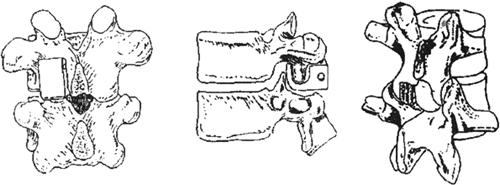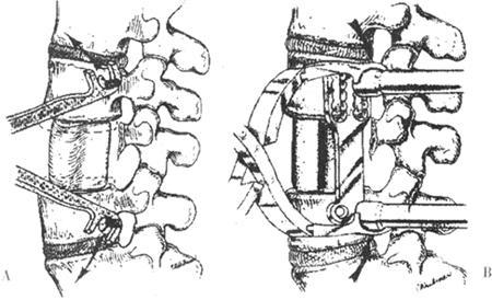 图13-41 28岁女性,T11爆裂骨折,术前侧位片(B)见骨折碎片向后压迫脊髓。前路手术减压,Z-plate Ⅱ固定,使用了钛网。因系统放置在椎体右侧,所以板的头部向下 很多研究者也报道了使用这种植入物在治疗不稳定胸腰椎骨折中取得的满意效果,但是,在它开始使用时人们未能考虑到脊柱的矢状轮廓,特别是腰椎,并且对不稳定性平移损伤的固定在力学方面上是不够的。临床和生物力学的资料都已经证明了传统的直Harrington棒的缺陷。最常见的并发症是脱钩,发生率大约为10%。McAfee等为确定不同的内固定器械在生物力学方面的优缺点提供了有价值的资料。他们认为Harrington撑开系统中最根本的失败部位是骨与金属的界面处。他们主张在治疗需要抵抗纵向压缩力的损伤和平移损伤时,包括骨折、脱位等,应该使用节段性钢丝固定的Harringtond撑开器械。Luque节段性脊柱固定器械可以更有效地稳定损伤节段以抵抗剪力和扭力,并且没有过牵的危险。McAfee和Bohlman证明技术因素或不恰当地使用Harrington器械使胸腰椎骨折的处理复杂化了。他们指出通过过度牵开力量来对椎管减压可以出现一系列的严重并发症。如果想通过后侧过度牵开使椎管前方的骨片或间盘碎片复位,则可能发生过牵、固定失败和医源性神经损伤。在他们的患者中最常见的并发症是Harrington撑开棒固定后椎管减压失效。原始的直Harrington棒最终得以改进,棒的预弯和使用方形头棒和钩使这种植入物成功地应用于胸腰椎损伤的复位和稳定。为了成功地应用Harrington撑开系统,前纵韧带应该完整。这个系统需要3点固定原则进行骨折复位,特别是在腰椎以维持正常的腰椎前凸,需要进行适当的预弯。一般来说,这种植入物也是脊柱专科医生最熟悉的。早期固定(48小时内)可以使大多数的患者恢复解剖学对位;当手术延迟到48小时至10天,通常无法获得解剖学复位,但是效果仍然不错;如果手术延迟到2周以后进行,则椎管面积几乎无改善。对一些超过2周未治疗的爆裂骨折,单纯通过后路Harrington撑开棒无法获得满意的复位,而需要通过前路减压加支撑植骨来减压。 手术方法:患者全麻,俯卧于加垫的脊柱手术架或手术台上,常规皮肤消毒铺巾。以损伤节段的棘突为中心作一后正中皮肤切口,用1∶500000肾上腺素溶液在皮肤、皮下、竖脊肌直到椎板层浸润,以减少出血。向深部扩大切口显露损伤节段以上和以下3个节段的后侧结构,向外解剖到横突尖,细心止血保持干的术野。通过X线片确定损伤的节段,确认出损伤水平以上的3个完整椎板的关节,切除关节囊,为上钩准备,并保证头侧椎体的下关节突部位不会因为安插钩而劈裂。然后在关节处安插两个分叉的椎弓根钩(图13-42)。在损伤水平以下两个椎体处辨认出椎板间隙,从下位椎板的上缘去除黄韧带,切除一小块椎板,为在椎板上安放下钓准备(图13-42)。然后在椎板深部安插两个上椎板钩。如果一侧椎板或一侧椎体受累较严重,则首先在对侧安插第一根撑开棒。插入棒后使骨折复位,然后插入对侧的棒。注意不要使骨折过牵,应将两棒撑开到合适为止(图13-43)。如果患者神经功能正常或有不完全性神经损伤,目前推荐在安插后路固定器械时,使用体感诱发电位监测仪,这可以在骨折复位和撑开脊柱时对脊髓进行生理学监测。通过手术台拍摄侧位X线片以评定对位和复位情况。也可以在蛛网膜下腔注射水溶性造影剂做脊髓造影,或切除一小块椎板,充入生理盐水后通过超声确定减压情况。单独通过插入撑开棒以获得后突骨块的完全复位是不可靠的。如果术中脊髓造影或超声检测证明复位不完全,并且有不完全性神经损伤,就要行侧后方减压,即用高速磨钻去除一部分椎板和椎弓根,用反角度刮匙从硬膜前方去除后突的骨片。然而,如果获得了解剖学复位或残留的压迫较小而患者神经功能正常,则进行后方和侧后方融合,对脊髓完全损伤的患者的融合范围要包括整个固定物的长度,而对神经功能正常或不完全脊髓损伤的患者,其融合范围只局限于损伤水平上、下各一个椎体。最好使用自体髂骨移植,如果需要也可以加入异体骨移植。在棒的棘齿端头侧钩的下方加C型垫片以预防复位的丢失,尽量减少最上端钩的下方所暴露的棘齿的数量,以减少晚期发生棒与棘齿结合部位折断的可能性。用抗生素溶液彻底冲洗伤口,插入封闭的负压引流管,按照常规缝合伤口。