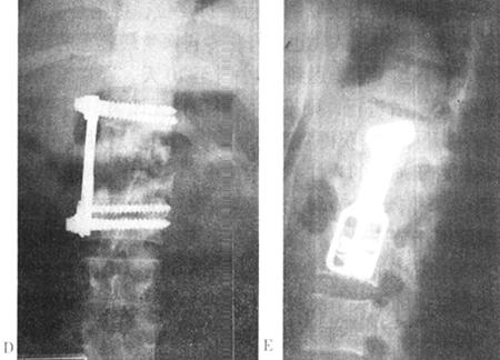 图13-40 25岁男性,被搅拌机搅伤,术前X光片和CT(A、B、C)可见L1骨折脱位,层叠于T12上手术采用右侧前方入路。L1椎体切除后获得复位,大块髂骨植骨和Z-plate Ⅱ内固定