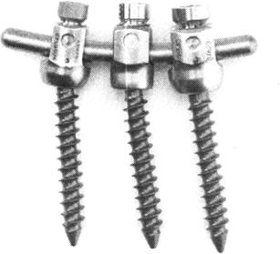 图13-45 固定Luque棒(A.拉紧钢丝使其贴椎板;B.将钢丝在Luque棒拧紧) 术后处理:通常术后不需要外固定。术后不久就可以不用支具固定开始康复训练。 三、Harrington加Luque器械 这种结合了Harrington和Luque系统优点的椎板下钢丝加Harrington撑开棒的技术,可以增加稳定性和加强抗脱钩性能,并被证实在处理不稳定胸腰椎骨折方面是有效的。完整的椎板抗骨折能力最强,其次按强弱顺序为去皮质骨的椎板、横突和棘突。所以Harrington棒的稳定性可以通过多节段椎板下钢丝固定得到加强。这种方法可以减低断棒的发生率并缩短术后制动的时间。一些研究的结果显示因为有使椎板下钩被推进下面椎管中的危险,所以压缩棒不应该与椎板下钢丝一起使用。对神经完全损伤和不稳定的胸腰椎骨折患者,椎板下钢丝固定增加了Harrington撑开棒的稳定性。在穿推板下钢丝时要特别小心,并且在神经功能正常或有不完全性神经损伤的患者中使用这种手术时,一定要考虑到神经损伤的危险性。 四、椎弓根钉内固定器械 早期的后路脊柱内固定器械使用钩和钢丝进行固定。现在更新更坚固的内固定系统是通过椎弓根螺钉来固定。早在1949年,Michele和Krueger就描述了经椎弓根的螺钉,1961年Roy-Camille开始应用椎弓根螺钉和钢板系统。欧洲的骨科医生后来开始广泛使用椎弓根螺钉,并将技术推广到北美。现在椎弓根螺钉是非常热门的固定方法,新型的后路内固定器械几乎都在使用。椎弓根螺钉是通过从后到前将螺钉经椎弓根拧入椎体,其优点在于可进行撑开压缩等多种操作,固定强度高,所需固定节段短。置入椎弓根螺钉时不要求后柱结构完好,故可用于附件有破坏的节段或后部结构有退行性变的节段。与其他的内固定器械相比,椎弓根螺钉能够提供三柱的稳定。根据Roy-Camille的生物力学测试,椎弓根钉能提供最坚强的固定,螺钉-骨界面的力量大大强于钩-骨界面或钢丝-骨界面。在动物实验方面,Gurr曾在小牛的脊柱作成不稳定骨折,然后用C-D器械从后路内固定骨折处的上两节和下两节,再做生物力学测试,其结果表明它的牢固程度较正常的(未受损伤)脊柱更为稳定。 因此,椎弓根钉系统能缩短固定融合的节段,有利于保持正常的矢状面形态。椎弓根螺钉的潜在并发症有神经和血管的损伤,如果螺钉穿透了椎弓根的内侧壁会损伤神经,如果向前穿透了椎体前方皮质会损伤血管。理想的椎弓根钉位置是全长都在椎弓根内,这样的固定的强度比椎弓根外固定(椎弓根/肋骨)高。 胸椎的椎弓根比较小,各节段的角度也不同,在胸椎使用椎弓根螺钉难度比较高。胸椎椎弓根直径最小的是T4~T9,T1~T3的比T4~T9大,T10~T12椎弓根的直径甚至比L1、L2的还大,所以最易穿透皮质的是T4~T9节段。一项使用CT的研究表明,大约有8.5%的胸椎椎弓根钉穿出皮质,但只有2.2%的钉穿出比较明显。然而椎弓根内侧的皮质厚度大于外侧皮质,螺钉往往都是穿透外侧皮质,穿透外侧皮质不会造成神经损伤。虽然许多椎弓根的直径都小于螺钉的直径,但椎弓根螺钉的螺纹很深,穿透皮质的只是部分螺纹,也不会造成损伤。所以有不少外国医生即使在青少年患者的胸椎都使用6.35mm直径的椎弓根螺钉,因其拔出力远远高于5mm的螺钉,在长期使用中也没有发生神经损伤。对于实在太小的椎弓根,或先天畸形的椎弓根,可以使用进-出-进技术(In-Out-In Techinque),先从进针点进入椎弓根,然后从椎弓根外侧穿出,穿过肋骨头再进入椎体(即椎弓根/肋骨固定)。如果发现螺钉穿透了内侧壁,则必须取出螺钉,换另一椎弓根或改用钩固定。术中进行SEP监测是最安全在方法,能够及时发现位置不正确侵犯脊髓的椎弓根螺钉,避免脊髓损伤。 最初的椎弓根钉器械是螺钉加钢板的系统,如Roy-Camille系统和Stefee系统(图13-46)。但初期的螺钉直径细小,螺纹浅,钢板的强度也不足够,所以植骨愈合率低,并发症发生率较高。后来发展了螺钉加螺纹棒系统,如Dick、RF(图13-47)、AF。螺钉和棒的系统比钢板系统更坚固,而且棒可在多角度预弯,使用更灵活。但螺纹棒安装烦琐,费时费力,不利于进行提拉和撑开,棒的强度也不够。新一代的系统使用钛合金为原料,光滑的棒代替了螺纹棒,螺钉和棒的连接采用了上锁紧的螺母,如:Moss Miami、CD-Horizon(图13-48)、ISOLA、USS(图13-49)。这些椎弓根螺钉系统使用简单方便,复位效果好,钉棒的断裂也较前大大减少,故得到了广泛的应用。最新的椎弓根钉系统继续改良钉与棒之间的连接方式和提拉撑开的方法,以求获得更快捷的操作和更好的手术效果,如Monarch(图13-50)、TSRH-3D(图13-51)、USS Ⅱ。