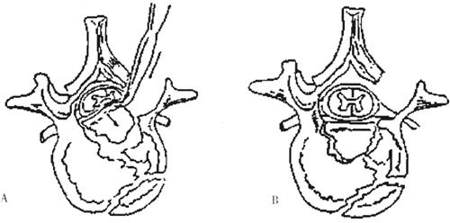 图13-52 椎弓根螺钉进针点和方向,左Roy-Camill法,右Weinstein法 定好进针点后,凿开外层皮质,用手锥钻孔,方向平行椎体终板与椎体后缘垂直,倾斜中线倾斜5°~15°,角度根据不同的椎体而调整。用力宜轻柔,顺椎弓根钻入,不能使用暴力。当钻入30~40mm时,取出手锥,用探针检查孔道四壁和底部。感觉四壁和底部均为骨质,提示定点和定向正确,孔道位于椎弓根和椎体内。当钻好所有的孔后,在孔内插入克氏针,使用C臂X线机透视,确认方向和深度正确,必要时作出调整。用丝锥攻丝,拧入长度合适的椎弓根螺钉,再次透视以确定螺钉位置。 (3)如需减压,此时可以切除伤椎椎板及上位脊椎部分椎板和下关节突。将伤椎的一侧椎弓根切除或两侧椎弓根内侧半切除,进入椎管。认清经椎弓根下缘向下外方行走的神经根,显露出硬脊膜囊的外侧面,操作中尽可能不牵动或压迫硬膜囊。用弯头的神经剥离器探查硬脊膜前方,若有松动的骨折片及破碎的椎间盘组织,均应在直视下钳夹取出。若椎体壁向后膨隆凸入椎管致硬脊膜前方受压,则可用弯头的硬刮匙经椎弓根切除后的缺口进入椎体,刮去椎体后部的松质骨,使椎体后壁成为薄层骨壳,再用小型骨膜剥离器把椎体后壁向前压入椎体(图13-53)。椎体骨质掺血可用骨蜡填塞,椎管内静脉丛出血可用明胶海绵止血。