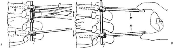 图13-54 A.使用撑开器进行撑开,恢复椎体高度;B.压缩螺钉尾部,使椎体前缘张开 (5)将横突去皮质,取自体髂骨作横突间植骨。放负压引流,逐层关闭切口。 对胸腰段骨折,用椎弓根钉内固定伤椎的上两节和下一节。对L2以下的椎体骨折,只固定上一节和下一节。术后用塑料支具固定12周,早期开始功能锻炼。