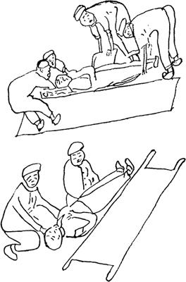 脊椎骨折时,急救与搬运非常重要,若处理不当,就可能发生或加重脊髓损伤。因此,对疑有脊椎骨折的患者,原则应保持患者脊椎平直,决不能随意搬动。若无休克,应使患者平直仰卧,然后将其滚动到担架上,或三人一起将患者托起(一人固定托头颈,其他两人分别托肩背、胸部和臀与下肢),平放于担架上,急送相当医院(图2-39)。