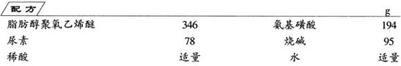 制法 将346g(1mol)脂肪醇聚氧乙烯醚置于500ml烧杯中,加入精制粉末状氨基磺酸194g(2mol)、尿素78g,搅拌均匀,水浴95C加热,保温搅拌1h,反应物由乳液变为透明体。反应结束后将膏状物移入三颈烧瓶,加烧碱95g(配成饱和溶液)。加入烧碱时有气体氨逸出,将其导入稀酸收集瓶中。物料用冷水冷却,保证其温度不超过60℃。调节pH值在10~12。中和结束后,抽真空排除残余氨气,1h后AES氨味消除,pH值下降至8~9,即为成品。本品具有色淡、透明度高、无异味的特点。 |