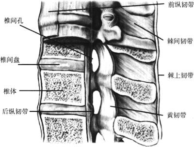 | 释义 | 脊柱的连接 脊柱各部分的连接复杂而多样化,既要维持脊柱的稳定,又要使各部分有充分灵活的运动,以应付各种生理活动的需要。椎间关节是重要稳定结构,但其功能随部位而异。颈段椎间关节接近水平位,可在各方向运动,特别是旋转,因此很少参与脊柱的稳定。在下腰段,椎间关节近似直立,屈曲伸直自如,侧屈稍受限,但几乎无旋转。此处脱位多合并关节突骨折。椎间关节退变可使椎间盘承受更多剪应力,引起脊椎滑脱。在下胸段和上腰段,椎间关节方向处于中间位,属于过渡型。此处活动范围较大,如棘间韧带断裂,可发生脱位。 脊柱连接由韧带、椎间盘及椎间关节构成(图1-25)。
