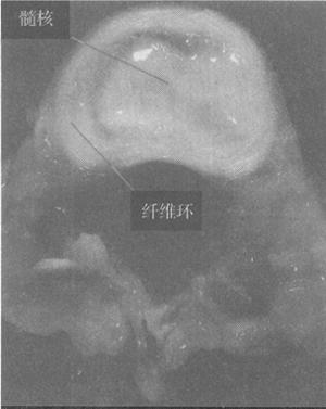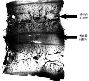 图1-29 小孩椎间盘纤维环和髓核(闪光发亮表明含水比例高) 胎儿期椎间盘内有血管出生后逐渐闭锁消失,除周围部外,无血管,其营养和代谢以渗透形式进行,所以随年龄的增长,椎间盘易发生退行性变,过度负重或剧烈运动可导致纤维环破坏,髓核突出,称椎间盘突出症,以第4~5腰椎间者多见。由于椎间盘前方有宽的前纵韧带,后方中部有窄的后纵韧带加强,后外侧薄弱并对向椎间孔,因此髓核常向后外侧突出,压迫脊神经。颈段椎间盘的后外方有椎体钩加固,胸段脊柱活动幅度小,故颈、胸段的椎间盘突出症较少见。 椎间盘的厚薄,在脊柱不同部位有所不同,在运动较多的部位如颈腰部位较厚,而在形成骨性腔隙的部位,如胸、骶部则较薄。Todd报告,L5~S1间的椎间盘可以厚达17.1mm,而胸4~5间的椎间盘仅为2.1mm。各段椎间盘和椎体的比例,颈段为27.5%,胸段为21.5%,腰段为54.4%。总体来看,椎间盘的总厚度约占整个脊柱椎骨全长的32.1%。颈椎间盘发生退变时,其高度变小,致使相应的椎间关节及钩椎关节关系发生紊乱而致骨质增生,相邻椎体后缘亦可发生骨嵴,引起神经根或脊髓受压。 腰椎椎间盘从矢状切面看,中部膨出,前后两端较大,稍内有一缩窄,全体犹如横置的花瓶,中部如瓶肚,两侧如同瓶口、瓶底及其颈部。有报道腰椎间盘厚度,前缘L1~L2为10.9mm,L2~L3为12.7mm,L3~L4为13.9mm,L4~L5为15.8mm,L5~S1为16.6mm;后缘L1~L2为6.4mm,L2~L3为7.6mm,L3~L4为8.7mm,L4~L5为9.7mm,L5~S1为8.5mm。上述测量显示椎间盘前、后缘厚度除腰前、后缘外,自上而下均逐渐增高,而前缘厚度均大于后缘。 (-)椎间盘的构造 椎间盘由软骨板、纤维环和髓核构成。纤维环由坚硬的致密胶原纤维形成,围绕髓核(图1-29)。 (1)软骨终板:软骨终板即椎体的上下软骨面做成髓核的上下界。在椎骨发生过程中,椎体的上下面各有一次级骨化中心,周围部虽成骨,形成骺环,但中心部仍一直保留为软骨。椎体上的软骨板可以防止椎骨受压,只要软骨板保持完整,椎体就不会因受压而发生骨吸收;软骨终板可视作半渗透膜,水分可以扩散至无血管的椎间盘。 (2)纤维环:纤维环与上下软骨板和脊柱前、后纵韧带紧密相连,作同心层排列。纤维环中各层纤维的方向彼此成30°~60°,相互编织。前部及外侧部较后部约宽1倍,后部层次少,相邻层的纤维接近平行,连接物质亦较少,最内层纤维与髓核的细胞间基质相融合,无明显界限(图1-27、图1-28)。 纤维环甚坚固,紧密附着于软骨板上,保持脊柱的稳定性。纤维环的特殊排列方向,使相邻椎体间可以有轻度活动,但当运动到一定限度时,纤维环紧张,又起到节制韧带的作用,管制旋转运动。纤维环主要由胶原纤维组成;也含有弹性纤维,可稍伸长。 (3)髓核:髓核是一种有弹韧性的液态胶状物质,约占椎间盘切面的50%~60%,位于椎间盘的中央,在下腰椎则偏向后方。髓核含有水分及退化的脊索残余。髓核由软骨样细胞和分散于细胞间的基质组成,并有分化较差且不太致密的胶原纤维网,含大量亲水性氨基葡萄聚糖的胶样凝胶。 髓核的形状由周围的纤维环及上下软骨板所限定,但可随外界的压力改变其位置及形状。髓核的基质和原纤维结构并无一定排列。儿童髓核的结构与纤维环明显划分;老年人由于髓核的纤维变粗,两者的区别则不明显。 (二)椎间盘的血供 胎儿及幼儿有血管分别从脊柱的前、后面中点,行向软骨椎体的中心。背内侧椎体动脉注入背侧血管湖,向上、下各分出一支,至椎间盘中心,即轴向椎间盘动脉,邻近脊索。腹内侧椎体动脉注入腹侧血管湖,与前者分布相同。 一般认为,成人椎间盘几乎完全无血管,仅纤维环周围有些小血管穿入,其营养主要靠椎体内血管通过弥散和渗透作用而获得(图1-30)。如椎体营养动脉发生变性或栓塞,必将导致椎间盘缺氧而使椎间盘变性、腰段椎体营养动脉末端卷曲,营养动脉数目愈向下愈少,第5腰椎最少,这也可能是L4~L5及L5~S1椎间盘容易发生病变的原因。