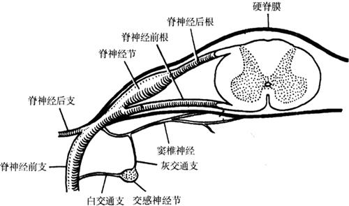 图1-30 椎体内的血管侧面观 (三)椎间盘的神经支配 分布于椎管的窦椎神经,发支至椎间盘。窦椎神经(sinu-vertebral nerve)或称脊膜支(ramus meningeus),有两个根,脊根起自脊神经或脊神经节,交感根常起自邻近脊神经节的后交通支或脊神经节。窦椎神经在脊神经干分为前后支之前发出,经椎间孔返回椎管。向上围绕椎弓根基底,行向椎管前面中线(图1-31)。在行程中,发出分支至后纵韧带、骨膜、硬膜外间隙的血管及硬膜。并发支行向相邻椎间盘,但是否进入纤维环尚存在不同意见(图1-32)。窦椎神经的上下分支相连,甚至越过中线与对侧分支相连,神经内同时含有感觉及交感成分。窦椎神经受刺激时,可引起腰部及股后肌群反射性痉挛及腰腿痛。
