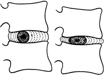 图1-36 髓核的支点作用 髓核的水分在出生时为88%,18岁时为80%,到77岁时只为69%。纤维环的水分在出生时为78%,30岁时约为70%,以后数值几乎不变,至老年开始稍见下降。髓核内的水分则随年龄增长而稳步下降。年轻人椎间盘突出后,水分丢失,胶原蛋白及粘多糖均减少。 髓核的营养经软骨板渗透,直立时椎体承受压力加大;卧位时,压力消除,肌肉张力减小,液体经软骨板渗透至髓核。血供贫乏可能是引起椎间盘早期退化的原因。 髓核的功能取决于界膜的完整,即上、下软骨终板及其周围的纤维环是否完好无损。髓核的半流体性质允许它在脊柱的活动中改变形状。 每个椎间盘及相邻椎体及骨突应视为-个运动单位,具有一定动力及机械功能。一个运动单位发生紊乱必然影响邻近运动单位。椎间盘的弹性及张力取决于软骨板的通透性和髓核的渗透性。椎间盘的吸液性如发生改变,不仅影响椎间盘的稳定性,而且可使椎间盘发生变性,椎间隙变窄,其后部椎间关节及椎间管必然受到影响(图1-37)。