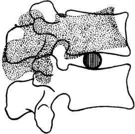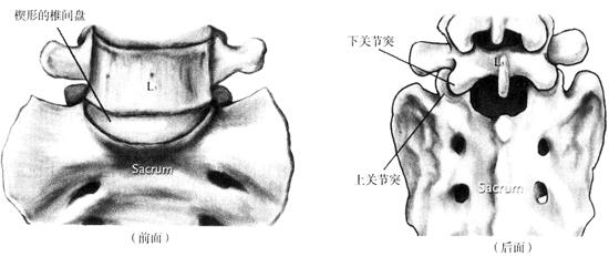 图1-46 腰骶部神经与骨骼韧带的关系 当身体直立时,在腰骶关节以及最下部数个腰椎椎弓峡部之间,剪力极大,突然用力或摔跌而发生的杠杆作用以及肌肉痉挛,都能使体重作用于这部分的剪力大为增加,腰骶角减小,可使此部分稳定性更为减低。第5腰椎峡部不连引起腰椎滑脱时,可使L5椎体向前滑移、腰椎前凸增加。腰椎椎体呈楔形变及第1骶椎顶端呈圆形变(图1-47、图1-48)。