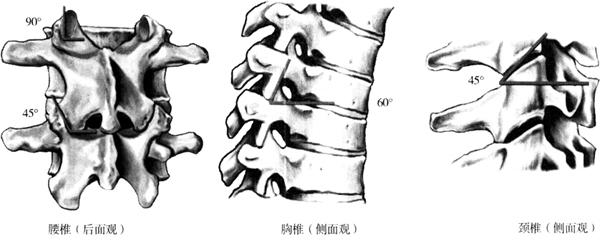 图1-38 不同椎体节段关节突关节的角度及其平面展示