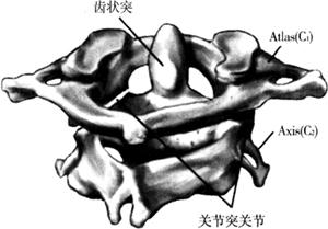 图1-40 颅骨的枕骨髁与寰椎的上关节面相关节 (二)寰枢关节(atlantoaxial joint) 寰枢椎之间有两个车轴关节及两个磨动关节,前者即齿突前、后关节,分别由寰椎前弓后面与齿突前面之间及寰椎横韧带前面与齿突后面构成;后者即两侧寰枢外侧关节。寰椎侧块的下关节面凹陷,枢椎的上关节面凸出。这种结构可使寰枢椎之间做最大旋转。寰枢外侧关节的关节囊及周围韧带松弛,允许在一定限度内有最大范围的运动(图1-41)。