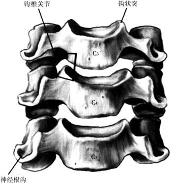 图1-42 寰枢、寰枢关节及其部分连接 枢椎齿突骨折后,如寰椎横韧带完整,齿突保持原位,不会引起严重神经症状。在自发性寰椎前脱位时,由于寰椎横韧带松弛、减弱或断裂,结果齿突后移,可使脊髓遭受压迫。 寰枢韧带复合体的次要部分有齿突尖韧带及翼状韧带等。齿突尖韧带也称齿突悬韧带,位于寰椎横韧带的深面,连接齿突尖于枕骨大孔前正中缘。翼状韧带是两个坚强的韧带,由齿突的上外侧面向外上,止于两侧枕骨髁的内面。翼状韧带是重要的节制韧带,可以阻止寰椎向前移位,并作为寰枢关节向前方半脱位的第二道防线,能限制头及寰椎在枢椎上过度旋转及侧方半脱位。头向右旋转时,左翼状韧带紧张;向左旋转时,右翼状韧带紧张。 寰椎横韧带是一个坚强的无弹性纤维带,使齿突局限于寰椎前弓后的齿突凹内。生物力学研究发现,寰椎横韧带是防止寰椎向前移位的主要坚强结构。如果寰椎横韧带保持完整,在荷载下,寰椎在枢椎上的移位不超过3mm。如果寰椎横韧带断裂,作为辅助结构的翼状韧带并不能防止寰枢关节脱位。 寰枢关节形态特殊,在发育上也较复杂,有以下几种异常:①齿突不连;②齿突发育不全;③齿突缺如;④齿突枕骨融合;⑤寰椎枕化。这些异常由于结构不稳固,或由于邻近椎骨的代偿性过度活动,常引起颈椎自发性脱位。 寰枢关节全体做成一个车轴关节,该轴垂直通过齿突,寰椎与颅骨即一同在此轴上向左右旋转,每侧约为40°,过度旋转受翼状韧带限制。正常头屈曲位时,寰枢关节间隙一般为2~2.5mm。 (三)钩椎关节(uncovertebral joint) 钩椎关节为C3~C7椎体后外侧各存在一个类似滑膜关节的结构,又称为Luschka关节、椎体间外侧半关节或椎体间侧关节(图1-43)。