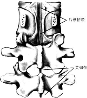 图1-49 腰椎(后面观) 后纵韧带通常在椎间盘水平与其纤维环紧贴,而在椎体水平则较疏松,其间有椎体静脉通过;韧带的中央部较厚,而两侧延展部较宽但薄弱,尤其是腰椎,这一解剖特点更显明显,因此是椎间盘突出的好发部位。椎间盘变性后,髓核突出常常发生在后纵韧带的两侧,而在正中央部较少见。突出的椎间盘或者是骨化肥厚的后纵韧带,可向后压迫脊髓。 后纵韧带骨化(ossification of posterior longitudinal ligament,简称OPLL)在东南亚各国发病率较高,我国发病亦不少见。男性后纵韧带骨化的发病率约为女性的2倍,最多见于50~60岁。发病部位以C5最多,其次为C4及C6,累及椎骨约2~5个不等。后纵韧带骨化分为节段型、连续型、混合型、限局型等4种。 后纵韧带骨化多无症状,常在无意中发现。颈椎骨折脱位可同时伴有OPLL。如椎管狭窄率(后纵韧带骨化厚度/椎管矢径×100)达到40%,更易引起脊髓压迫症状。 (三)黄韧带(ligament flava) 黄韧带系由薄而坚韧的黄色弹性纤维构成,故名。该韧带主要部分位于椎板间又称椎板间韧带或弓间韧带。黄韧带呈膜状,成节段性结构。黄韧带向上附着于上位椎弓板下缘的前面,向下附着于下位椎弓板上缘的后面,薄而较宽,犹如屋瓦叠掩。黄韧带前面凹陷、光滑,正中部有一裂隙,其间有少量脂肪组织,并伴有静脉通行。黄韧带为弹性结缔组织膜,后中央部与棘间韧带相连,向外至关节突关节内侧缘,向外侧扩展部附着于横突根部,同时近关节处与关节囊相融合参与形成关节囊(图1-25、图1-49)。黄韧带有一定弹性,脊柱屈曲时,可随相邻椎弓板稍伸展;过伸时可稍缩短,而不致发生皱褶突入椎管内。 黄韧带厚度和宽度在不同部位也有差别。颈椎节段薄而宽,胸椎则厚而略窄,腰椎的黄韧带又厚又宽。在同一节段的黄韧带,上部较薄,下方较厚。退变的黄韧带因失弹性可明显增厚。黄韧带占据椎管背侧3/4面积,正常厚度约3~4mm,其厚度由上向下逐渐增加,在L1~L3,外侧部较内侧部稍厚。Spurling(1937)测量黄韧带厚度,L3~L4平均为4.3mm,L4~L5为4.4mm,L5~S1为4.2mm。郭世绂等(1987)测量黄韧带厚度,L1~L2为3.4mm,L2~L3为3.5mm,L3~L4为3.9mm,L4~L5为4.3mm,L5~S1为3.6mm。中线部位如黄韧带厚度超过4mm,即可视为不正常。在正中线,两侧黄韧带之间有一缝隙,有连结椎后静脉丛与椎内静脉丛的小静脉通过,并有少许脂肪填充。如硬膜外脂肪缺少,可使硬膜活动减小。外侧黄韧带延伸至椎间关节的关节囊,它的侧缘形成椎间孔的软组织性后壁,因此除椎间孔和后方正中线的小裂隙外,黄韧带几乎充满整个椎弓间隙。腰椎之间的黄韧带间角比椎弓板间角向后突出5mm左右,与硬脊膜囊间的距离最大。胸椎之间的黄韧带窄小,韧带间角后突亦减少。 连续的外伤可引起黄韧带肥厚,甚至厚达10mm以上。椎骨伸展损伤,黄韧带皱褶突入椎管内,均可引起椎管狭窄症,致神经根遭受压迫。在第4、5腰椎椎弓板之间,黄韧带常增厚,同时毗邻的椎弓板亦往往增厚。第5椎间孔较小,而通过的神经根较粗大,当黄韧带过度增厚时,该神经根极易受到压迫。 (四)棘上韧带(supraspinal ligament) 棘上韧带系由项韧带向下至第7颈椎棘突开始,为一细长、坚韧的条束状带,附着于椎节棘突尖部,止于骶骨的骶中嵴。两侧与背部筋膜相连续,其前方与棘间韧带相愈合,界限很难分开。在不同节段上,棘上韧带的宽窄与厚度不一样。胸椎段呈条索状并较薄,腰椎宽厚坚韧。该韧带纤维可以分为浅层、中层和深层。浅层纤维通常跨越连续3~4个椎节的棘突尖,中层可跨越2~3个椎节,而深层纤维仅连接两个椎节棘突之间。浅层纤维具有充足的弹性,强于中层和深层。成人腰椎的棘上韧带具有很强的张应力,其功能作用与棘间韧带及腰背筋膜相一致;其退变可能发生软骨化,或有撕裂、囊性变,偶尔缺如。 在腰部,起自棘突的竖脊肌腱性起始部易被误认为棘上韧带。它与棘上韧带的区别是:构成竖脊肌腱性起始的腱束密切相接,借坚强的横行纤维束相连;仅止于L3或L4,随年龄增加,自深层开始有纤维软骨化,以后逐渐发展至骨化。 由第7颈椎棘突向上,棘上韧带移行为项韧带。项韧带呈三角形,底部向上,附着于枕外隆凸和枕外嵴;尖向下,附着于寰椎后结节及C2~C7棘突的尖部;后缘游离而肥厚。 项韧带主要由弹性纤维组成,可含纤维软骨。项韧带钙化可呈分节、棒状、条状或小斑点状,其粗细、长短不等,多发生于退变椎间盘后方1~2cm处,一般不引起症状。 郭世绂等(1986)对300例颈椎病X线片进行检查,发现有项韧带钙化者占22.3%,多数呈杆棒状,少数呈卵圆形密度增高阴影,其大小在2.6mm×8.7mm~5.8mm×47.2mm之间。 项韧带钙化多出现在C5~C6水平,约65.7%与其同一水平有椎间隙狭窄。颈部反复的屈伸及旋转活动,可使项部肌肉出现劳损而加重项韧带的负担。项韧带钙化可能是慢性累积性损伤、出血及炎症的结果,也许会加速颈椎间盘的退变。 (五)棘间韧带(interspinal ligament) 棘间韧带薄而无力,位于相邻椎节的棘突之间。在一节段水平,该韧带沿棘突基底道棘突尖,充盈棘突间。韧带的前部与黄韧带中央裂隙部相贴,后部逐渐移行于棘上韧韧带。颈椎和上胸椎棘间韧带发育欠佳,较松弛薄弱;腰椎厚而坚韧,发育相当完善。从纤维分层解剖来看,L1~L2、L2~L3和L3~L4可分为4层;L4~L5与L5~S1的棘间韧带分为3层。 棘间韧带和棘突列于腰背部中央,成分间隔,将腰背肌分为左右两部,形成对称结构。棘间