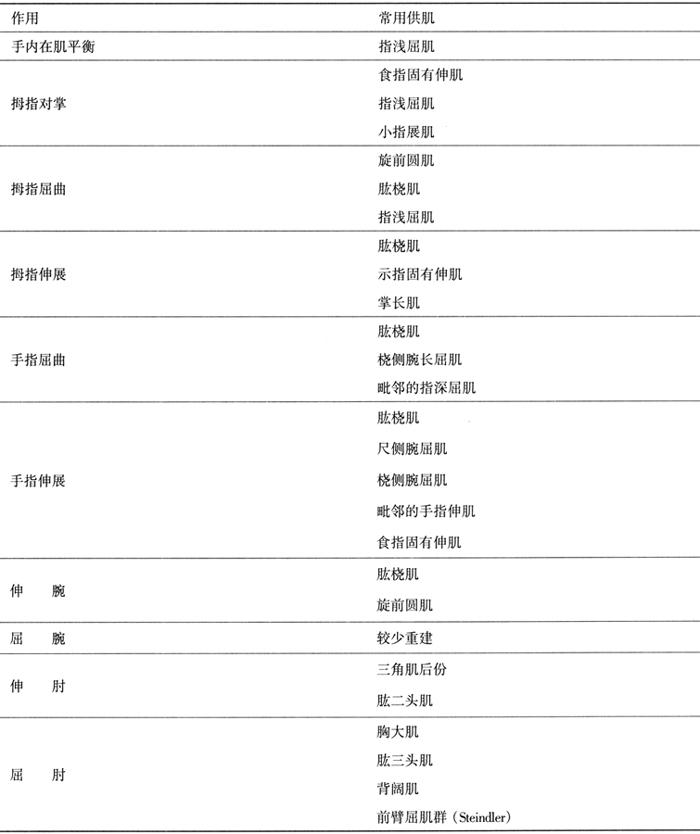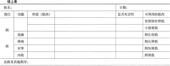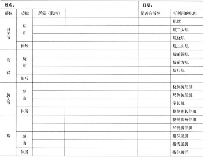 D.混合性周围神经麻痹/臂丛麻痹/脊髓麻痹 对于混合性神经麻痹,如在涉及多种神经损伤或臂丛、脊髓等更接近中枢的损伤病人中可以见到的症状,Higgs设计了一个简便易行的表格以记录哪些功能尚存、哪些功能缺失、哪些功能需要重建等。表格还列出了可利用的肌肉及其功能。一旦完成了表格的所有内容,哪些肌肉可用于转移以提供各种所需的功能便一目了然(表15-9)。 表15-9 肌腱转移术中可利用的肌肉