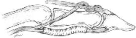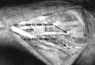 图15-7肌腱的并列联结调整(side-by-side adjustments)以保持外在平衡 转移一块肌肉也可能改善虽存在但已经削弱的功能。这种情形常见于拇长伸肌功能减弱或丧失及拇内在肌麻痹时转移肌肉以替代拇长屈肌功能的病例中,它会产生拇指指间关节过伸的效果,除非后者已事先稳定。指间关节的稳定可通过关节固定术或转移促稳定物而实现。Higgs偏好后一种方法,此种情况下,可使用劈裂的拇长屈肌转移至拇长伸肌(图15-8)。