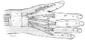 (五)相关解剖及禁忌症 1.相关解剖 应精选能与待恢复功能产生协同作用的肌肉作为供肌。腕伸肌群和指屈肌群就是一个协同肌群的例子。正常活动中,腕伸肌群收缩的同时指屈肌也被触发收缩。这一活动能稳定腕部,使指屈肌收缩的效果达到最优化。这就使腕伸肌成为肌腱转移术供肌肌肉的较好选择,以利于提供手指屈曲的功能。腕伸肌通常和指屈肌同时收缩,这使得术后运动功能的再训练变得容易。 其他一些协同肌群包括腕屈肌群和拇指/手指伸肌、示指固有伸肌和拇长伸肌等。 相反地,若一组肌肉松弛的同时另一组是收缩,那么病人要学会自主控制将更为困难。比如,用腕屈肌提供手指屈曲的功能或腕伸肌提供手指伸展的功能等,这些都是不同步或不协调的活动。 与所要行使的特定功能无直接关系的肌肉有时是极好的供肌。例如肱桡肌,它经常用于替代手指或拇指的屈曲、腕关节和手指或拇指的伸展等功能。肱桡肌的肌力、收缩幅度及其额外的功能的特性(即其他肌肉可不同程度代替其功能)等使其经常被作为供肌肌肉。旋前圆肌则是行使腕关节伸展功能的替代肌。 除了要考虑合适的供肌外,还要注意供肌的收缩幅度和其替代行使功能的能力应尽可能相匹配。替代能力一般和肌肉的横截面积有关,而收缩幅度则与肌纤维的长度有关。 最好只是纯粹转移肌-腱单位而不需植入移植物(graft)加强,但也并非绝对,当合适的供肌不能完全符合要求(如不够长),也可应用肌腱移植物插入以增强之。 供肌应只用于替代一种的功能,而且最好只跨过一个关节。转移的肌肉若要跨过两个关节,而且要使两个关节都产生运动,增加功能恢复的难度,有时可能难以实现。若确需要横跨一个以上的关节,最好适当固定其中一个关节以利于功能的最优化。例如,应用肱桡肌转移可较好地替代肱三头肌功能,如其能稳定肘关节在伸展位则可提高转移的功能。实际情况是,企望转移一个肌-腱单位能提供一个以上的功能,其结果往往令人失望。 2.禁忌症 肌腱转移惟一的绝对禁忌症是缺乏合适的供肌。肌力小于5级的肌-腱单位转移是相对禁忌症。与此类似,失神经支配之后复神经支配的肌肉作为肌腱转移的供肌也是相对禁忌症。对患有进展性神经肌肉疾病的病人,计划进行转移之前需慎重考虑,因其潜在的疾病可能会影响到转移的功能单位。最后,要使欠柔软的关节产生运动,应用转移术可能难以达到满意的效果。 (六)检查 1.实验室检查 对需要肌腱转移的病人应该检查以明确哪些肌肉适于转移、哪些肌肉的功能需要恢复等。 惟一需要的实验室检查是有关确认病人能否耐受手术的检查项目。 2.影像学检查 对僵硬的关节行X射线照片,以明确能使关节柔顺度增加的可能性。若与待恢复功能有所涉及的关节有严重的关节炎状况,则施行转移术属于相对禁忌症。 3.其他检查 若功能的丧失是继发于神经源性疾病或周围神经损伤,神经传导检查(NCS)和EMG可有助于区分永久性损伤和恢复期损伤。EMG检查能早期显示失神经支配的图式,随后则可见复神经支配的证据。运动单位的电位信号在亚急性期(6周到3月)没有出现的话,提示不大可能得到恢复。 (七)治疗 1.内科治疗 对于神经性疾病,某些内科治疗可能有效,并可从麻痹中得到长期恢复。在脊髓损伤时,功能运动依赖性疗法通过改善损伤的程度而改善疗效。对所有的病例,在等待损伤稳定或功能恢复的同时,有必要进行被动锻炼保持关节柔软。因为当关节僵硬时,功能恢复或以后进行重建等将难以成功。 要保证关节柔软,最简单的方法是一开始就要防止其僵硬,通过主动的和被动的运动以保持关节的柔顺。显然,大多数措施包括被动运动的方法和家庭治疗方案,都需要病人的积极参与。 除手术重建外,还有矫正工具、夹板或假肢等方法可供选择(图15-1)。