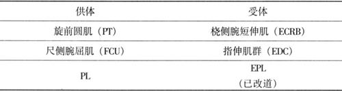 图15-6 固有食指伸肌转移至拇长伸肌 以往,人们尝试过各种各样的肌腱联合转移术。其术式的选择多取决于外科医师的经验和偏好。Higgs的习惯是偏向于旋前圆肌(PT)转移替代桡侧腕短伸肌(ECRB)行使腕伸功能,尺侧腕屈肌(FCU)转移替代指伸肌群(EDC)行使伸指功能,PL至改道的EPL以行使伸拇功能(表15-7)。若掌长肌缺如,则可用环指浅肌转移以替代行使伸拇功能。 表15-7 高位桡神经麻痹的肌腱转移