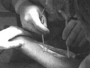 图15-9 神经肌肉刺激器 一旦供体肌腱切取后,就将其引至受肌处,通常选取最直接的路径。如有可能,最好将其排列在前臂周围而不通过骨间膜,因为这可导致粘连,降低功能。Higgs偏好Pulvertaft编织法(Pulvertaft weave)连接供肌和受肌肌腱(图15-10)。