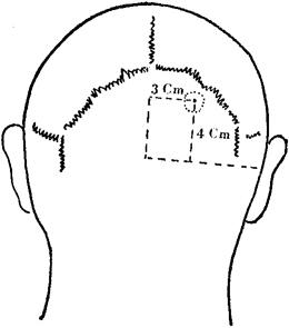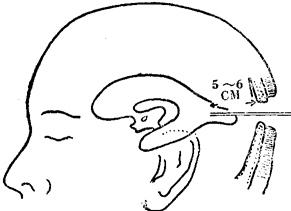 图143 侧脑室后角穿刺方向 2.用脑针向眉间方向穿刺,一般距头皮约7~8厘米处进入脑室,有脑室扩大者,约3~5厘米可达脑室(如未能进入脑室,可改变方向重新穿刺),或作对侧脑室穿刺。 3.测量脑室初压后,先缓慢放出脑脊液5~10毫升,继而注入等量气体,进行气液交换,一般交换至无脑脊液流出,轻度脑室扩大者,约需注气40~50毫升,脑室明显扩大者,约需100~200毫升。 (二)额部前角穿刺:该部脑皮层血管较多,易出血,可因肿瘤压迫而移位,故穿刺易失败,如需作脑室持续引流时,此法较为方便。 于发际内,冠状缝前2.5厘米,中线旁开2.5厘米处,作3厘米长的切口,穿刺方向与矢状平面平行,向同侧外耳道方向刺入约4~6厘米,即可进入脑室,而后充气造影(图144)。