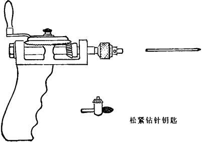 图144 侧脑室前角穿刺术 (三)前囟穿刺:婴儿可直接由前囟穿刺脑室,穿刺点在前囟的外侧角,以22~20号长约5~6厘米的小儿腰穿刺针,刺入头皮后,改为垂直方向进入脑室,注气造影或放液减压。 (四)经眶穿刺:于眶上缘中点,眶上缘和眼球之间,先以骨髓穿刺针(或直径不小于2毫米粗的钢针),刺透上睑皮肤后,针尖向上后方呈45度倾斜,直达眶顶,穿透眶顶,再用20号腰穿针向后上方刺入约5~7厘米,即达脑室额角。 此穿刺法,多用于颅后凹病变急救时,以减低颅压。近来已较少应用。 (五)简便快速钻颅穿刺法: 1.器械准备:手摇快速钻颅器一套(钻把一只,钻针2~3个,钻头松紧钥匙一个),以及其他常规器械(图145)。
