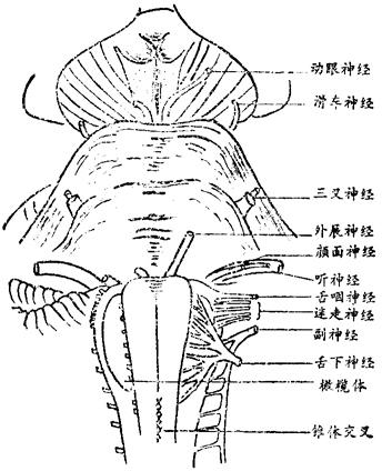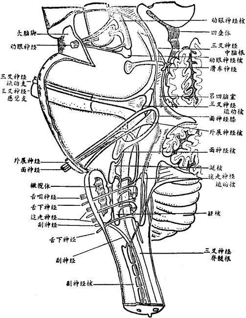 图17 脑干颅神经核及其神经 中脑大脑脚深处,有一灰质团,叫黑质。中脑上段有一对较大的红核,此是锥体外系统结构,对调节肌张力有重要作用。延髓背侧有薄束核和楔状束核,由薄束、楔状束而来的纤维,止于核内细胞。 网状结构:网状结构是脑干内的细胞核团,是各种反射与传导的中继站,大致有:①构成生命中枢,如延髓的心脏调节中枢、呼吸中枢、血管运动中枢、呕吐中枢等;②上行激活系统,自延髓上行,经桥脑、中脑被盖于间脑基部,接受上行神经束的侧支,发出轴突,经多次神经元交接,上行至大脑皮质,不断发放神经冲动,以维持大脑的醒觉作用;③下行调节系统,调节身体的肌张力。 |