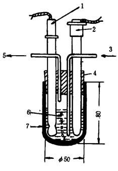 图10-7-3 ISOR182pH测定池 1-玻璃电极 2-干汞电极 3-气体入口管 4-塞子 5-气体出口管 6-KCl溶液 7-玻璃池