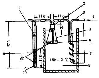 图10-7-4 ASTM793-49(70)化学滴定法测试装置 1-磨口玻璃塞或橡皮塞 2-橡皮塞 3-Φ6玻璃管 4-氮气入口 5-250毫升烧瓶 6-试样 7-预热器 8-油浴 9-NaOH吸收液4g/1 10-内径20
