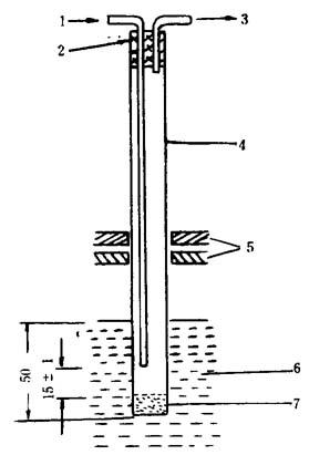 图10-7-2 ISOR182pH法反应管 1-气口体管 2-塞子 3-气体出口管 4-试管 5-隔热板 6-油浴 7-试样