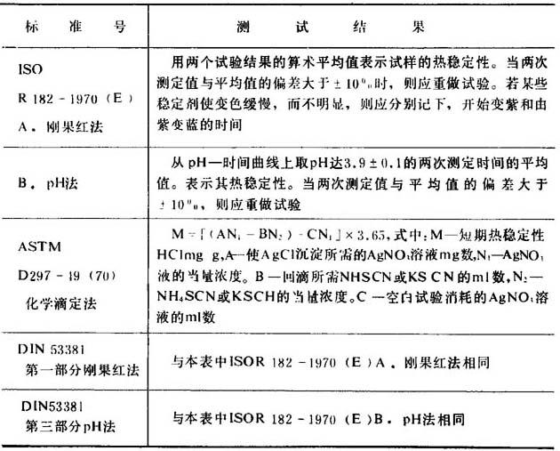 | 释义 | 脱氯化氢法 本方法是在规定温度的静态或动态气氛中,测定试样开始放出氯化氢所需的时间,或测定单位重量的试样在规定时间内放出氯化氢的量来评定其热稳定性。 (一)有关的标准 ISOR182-1970(E)用脱氯化氢法测定聚氯乙烯和有关共聚物及其混合料的热稳定性。 ASTMD793-49(70)含氯塑料短期热稳定性测试的标准方法。 DIN53381第一部分,氯乙烯聚合物和共聚物及其混合料热稳定性的测试。 TOCT14041-68用刚果红法测定聚氯乙烯和有关共聚物及其混合料的热稳定性。 SG22-73电缆工业用软聚氯乙烯的热稳定性测定。 (二)试验装置