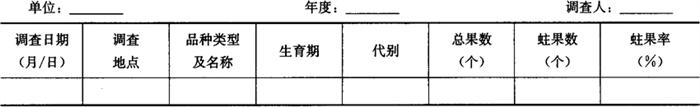 1.2 田间发生调查 1.2.1 发生程度调查 1.2.1.1 调查时间 从谢花至收获期,在每代幼虫盛发期调查1~2次。 1.2.1.2 调查方法 选择有代表性的早、中、迟熟品种果园,按对角线5点取样,每点定点调查1株。每株按东、南、西、北取样调查树上果20个,每品种查果400个。记录蛀果数、计算蛀果率,填入表7-96。 表7-96 荔枝蒂蛀虫发生程度(树上果)调查表