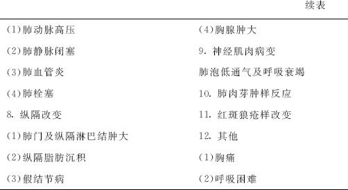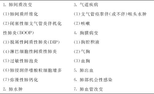 五、病理 药物性肺损害的病理组织学改变无特异性,可表现为各种类型,病变累及包括气道、肺泡、肺血管、胸膜在内的整个肺脏,而最多见、最重要的是肺泡病变、间质性肺炎、过敏性肺炎和嗜酸粒细胞性肺疾病中的药物性肺炎。间质性肺炎的病理学改变可按特发性间质性肺炎(IIP)的7个病理组织类型的标准来分类。药物性肺损害最多见的是普通型间质性肺炎(UIP)、非特异性间质性肺炎(NSIP)、机化性肺炎(OP)、脱骨型间质性肺炎(DIP)和弥漫性肺泡损害(DAD)等。药物性肺损害的病理改变不具有特异性。 六、检查 1.影像学检查 药物性肺损害的影像学所见以双肺斑片状或弥漫性浸润影及毛玻璃影最多;一般为双侧性,但当一侧肺部既往存在破坏性疾病或因手术、放射性损伤时,对侧肺阴影明显,这是药物性肺损害的特点。 药物性肺损害中最重的病理类型是弥漫性肺泡损害,致病药物多是抗肿瘤药,临床表现为急性呼吸窘迫综合征(ARDS)。弥漫性肺泡损害的影像学改变为双侧弥漫性或斑片状浸润影、毛玻璃影,随病情进展,肺容积减小以及牵张性支气管扩张,最终导致肺内结构改变。此类患者多预后不良。吉非替尼和来氟米特引起的药物性肺损害较易发生弥漫性肺泡损害,是引起重症肺损害危险性较高的药物。此外,也有一些药物几乎不引起弥漫性肺泡损害,其药物性肺损害的病死率低。 嗜酸粒细胞性肺炎可见肺泡间隔和肺泡腔内嗜酸粒细胞广泛浸润;影像学上常见以周围肺野为主的斑片状浸润影和毛玻璃影,及支气管血管束和小叶间隔肥厚等广义的肺间质病变为特征。 机化性肺炎型是药物性肺损害中病理改变与特发性机化性肺炎(cryptogenic organizing pneumonia,COP)相似的一种类型,以气腔内机化为主要病理所见;影像学上多见周围肺野多发呈非区域性多发浸润影或沿支气管血管束的多发浸润影,而牵张性支气管扩张等的肺内结构改变并不多见。 多种药物可引起非特异性间质性肺炎型肺损害,表现为不同程度的细胞浸润和纤维化的间质性肺炎。与特发性肺纤维化(IPF)中的普通型间质性肺炎(UIP)不同,其病变时相呈均一性。影像学上呈周围肺野或沿支气管血管束的浸润影、毛玻璃影,并伴有不同程度的网格状影、牵张性支气管扩张等结构改变;结构改变程度伴随纤维化的发展逐渐明显,而形成蜂窝肺。与UIP相比较,其周围肺野的病变较轻。表现为UIP的药物性肺损害罕见,典型表现为肺叶下部容积减少、胸膜下非区域性的毛玻璃影以及形成蜂窝肺。 肺血管炎是由抗甲状腺药物引起的抗中性粒细胞胞浆抗体(ANCA)阳性血管炎,临床上多因肺泡出血而发病。此外,减肥药芬氟拉明可引起原发性肺动脉高压样的肺动脉高压,表现为近端肺动脉的扩张。 药物过敏性肺炎并不像夏季过敏性肺炎那样是经气道吸入抗原引起,而是对药物产生某种变态反应导致特征性的肺泡间隔的单核细胞浸润、脆弱的肉芽肿形成等病理学特征改变,影像学上可见弥漫性毛玻璃影、小叶中央型或广义间质分布的低密度小结节影。最具代表性的致病药物是针对风湿性关节炎而应用的小剂量甲氨蝶呤。 细支气管病变虽少见,但由D-青霉胺等引起的闭塞性细支气管炎已有报道。最近还有某些健康食品引起闭塞性细支气管炎的报道。影像学上主要表现为肺含气量增加所致的透光度增高,而作为细支气管炎表现的小叶中心性结节和分支状阴影并不明显,这点有别于毛细支气管炎(bronchiolitis)。 药物性肺损害的影像学改变多种多样,没有特异性,基本上依靠排除诊断,因此诊断时有必要密切结合临床症状、病情经过和辅助检查结果。影像学在药物性肺损害诊断中的作用有:判断既往是否存在肺部疾病,根据影像学进行鉴别诊断,判断预后和临床经过等。 2.除影像学检查外,临床检查还包括实验室检查、肺功能检查(对于一些特定情况下肺损害发生率高的患者,如应用博来霉素,可通过监测肺弥散功能来发现一些亚临床肺损害)、心脏超声检查、痰液的病原学检查(革兰染色、细菌培养、真菌和结核检查及少见的病原,如卡氏肺孢子虫等)、免疫学检查(除外结缔组织疾病和血管炎)。如诊断还不明确,可考虑侵入性检查,如支气管镜、肺泡灌洗检查及经支气管镜肺活检。对于诊断困难的病例,特别是间质性肺病,可考虑经胸腔镜肺活检。 七、临床表现 1.间质性肺疾病 许多药物可引起间质性肺病,通常为2种形式:①亚急性或慢性间质性肺病,类似原发性肺纤维化,称慢性肺泡炎或纤维化综合征;②过敏性肺病,呈急性表现,常有外周和组织嗜酸粒细胞增多。患者表现呼吸困难、咳嗽、发热和体重减轻,无特异性;查体可发现肺内吸气末期啰音,杵状指罕见;胸部X线检查显示双肺网状或网状结节样改变;肺功能检查为限制性通气功能障碍,用力肺活量(FVC)减少,FEV下降,FEV/FVC正常,肺弥散功能下降。此种类型的肺损害通常预后不良,对糖皮质激素的治疗反应不一,而且常遗留明显的肺功能损害。 常见致病药物有博来霉素、胺碘酮等,多呈剂量相关性改变,见表5-7。 表5-7 可引起间质性肺疾病的常见药物