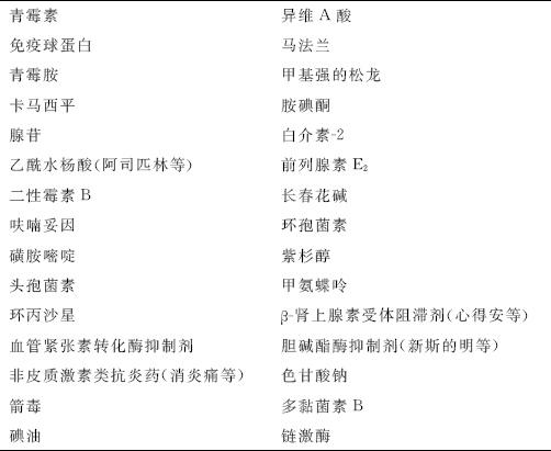 3.气道疾病 (1)支气管痉挛伴(或不伴)喉头水肿:有许多药物可导致支气管痉挛,但机制尚不十分清楚,可大致概括为变态反应、药理反应和直接刺激三方面。青霉素、免疫球蛋白和碘油等可通过变态反应引起支气管痉挛;吸入色甘酸钠和多黏菌素B多通过直接刺激引起;其他多数药物,如β-受体阻滞剂、血管紧张素转化酶抑制剂、非皮质激素类抗炎药、前列腺素E2以及阿司匹林等,则可通过体内药理作用,导致支气管平滑肌收缩,进而引起本症。 阿司匹林导致的支气管痉挛在普通人群中的发生率少于1%,而在稳定期哮喘患者中的发生率可达4%~20%。阿司匹林过敏还可导致荨麻疹、血管水肿、结膜充血和鼻炎。阿司匹林过敏、哮喘和鼻息肉被称为阿司匹林三联症。一些支气管扩张剂和抗炎药通过定量吸入器或雾化吸入时也会导致支气管痉挛,这可能与氯氟碳抛射剂、溶解剂及稳定剂等有关(见表5-9)。 (2)咳嗽:能引起单纯咳嗽的药物主要有血管紧张素转化酶抑制剂、白介素-2、甲氨蝶呤、链激酶和激素。其作用机制尚不清楚。 表5-9 能引起支气管痉挛的药物